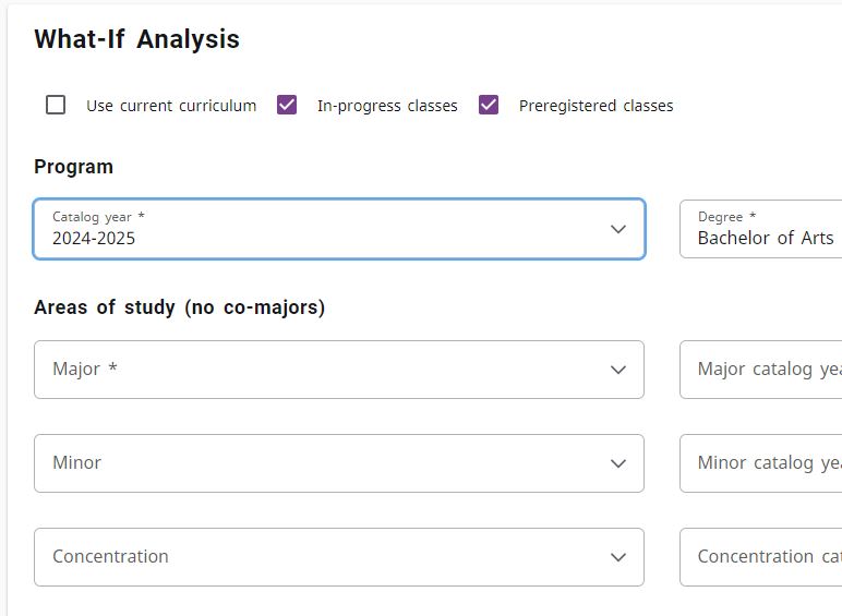 You may also try using the “Look Ahead” feature to double check your “planned” courses. You’ll find the “Look Ahead” feature under the “What-If” link, just below the “Areas of Study” section. If you want to use the “Look Ahead” feature with your current major/minor, just select “Use current curriculum” under the What-If analysis section. The “Look Ahead” feature will show you where any courses you plan to register for will count in your degree audit, so you can make sure your planned classes are fulfilling the requirements you expected them to.